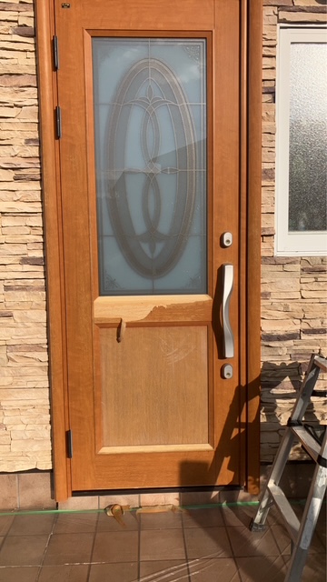 特殊な粘着剤でドアの凹凸部分もきれいに貼る事が可能なダイノックシートで玄関ドアのリフォームをしました。