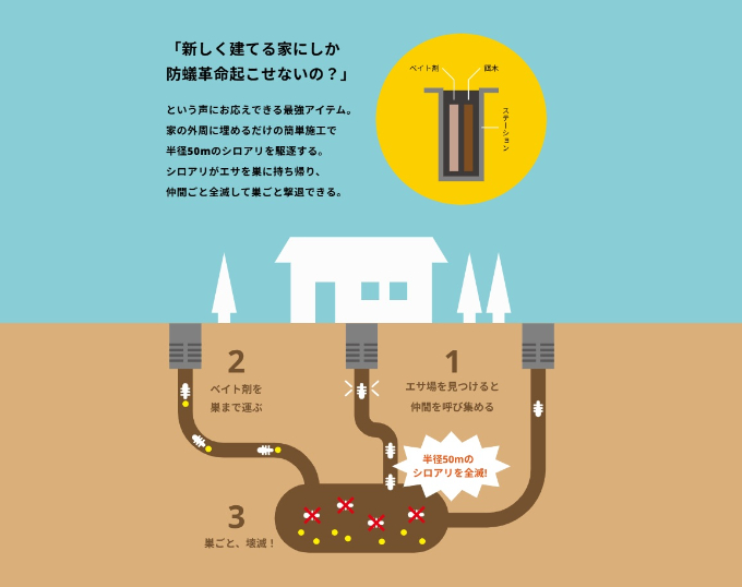 薬剤の有効成分は、クロルフルアズロンという成分を使っており、昆虫の脱皮を阻害する効果があり、遅効性の毒として機能します。ベイト材を食べた兵隊アリが女王アリに食べさせることで女王アリも同時に死滅させることができるため、同じ巣からの被害を受けることがありません。